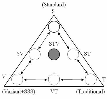 期间,中国主要社会变革和汉字改革(语言规划)活动间的联系。此种比较研究,使得我们进一步加深了社会变革和语言规划之间的联系。本章中,作者在足够的实证性语料基础上所构建的汉字使用者三角模型(图2-3)对于理解汉字使用的现状很有价值。在现实社会中,很难找到完全使用一种字体的人,但大多数人均可在下面的三角形里定位自己的用字情况。