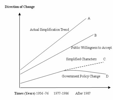 语言规划模型对1986年前后汉字现代化活动的特点进行了分析比较。具体内容可参见表6-3,这里不再详述。最后一章(第七章)分析了一些难以归并到前面几章,但和汉简又密切相关的问题,主要是,罗马化问题,二简仍在使用的问题,繁简转换问题等,这些都是令人关心又难以回避的。按照Zipf提出的语言“最小省力原则”,汉字简化的总趋势是无容置疑的,但理想和现实也总是有差距的。作者用一个示意图给出了汉字简化的趋势(图7-1):